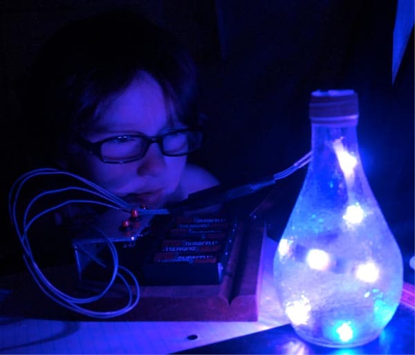 Over the next three nights we drilled holes, took turns soldering, connected switches to a battery holder and tested all our connections with a multi-meter as we went (no cold solder joints in this house, thank you). Our one year old, Walter, rode on my back in one of those child carriers that all young parents are compelled to own, and the older kids passed around safety glasses, asked questions and worked. We crammed the LED strips into an Orangina bottle, and we had a RGB lamp with independent controls for each color: